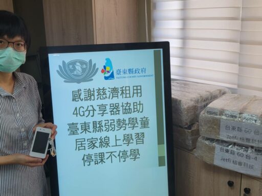 在國內因為武漢肺炎疫情三級警戒之後,全國各級學校都停止到校,改為在家遠距上課,但是台東偏鄉部分家庭無網路,除了政府本身的資源幫助之外,慈濟也向企業租借297支無線網路分享器給台東縣政府,作為讓弱勢學生上網學習之用。