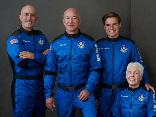 貝佐斯的同行者包括他弟弟馬克‧貝佐斯(Mark Bezos)、82歲的太空競賽先驅馮克(Wally Funk)和18歲學生戴蒙(Oliver Daemen)。後兩人如今成為前進太空歷史上最年長和最年輕的人。