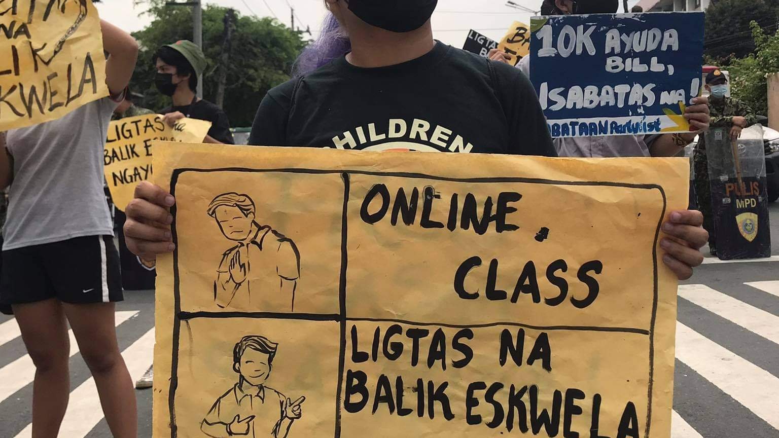 菲律賓各級學校雖然新學期開學,但因Covid-19疫情持續,學生已經超過500天無法到校上課。菲律賓學生和家長走上街頭,要求政府在兼顧防疫需求下開放實體課程。