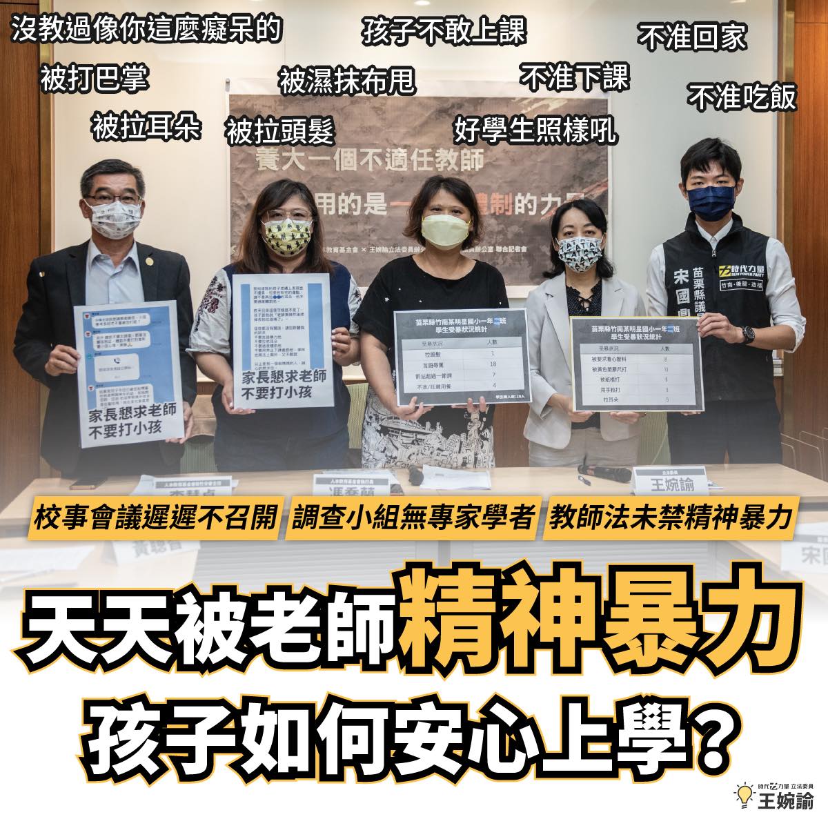 記者會中指控苗栗某國小楊姓教師涉及對學生體罰及精神暴力,包括言語公開辱罵、罰站超過一節課、不准吃飯等,這名教師甚至曾向班上許多學生家長說,孩子應該去看心智科,經醫生診斷無異常後,老師還以此為笑柄譏笑學生。