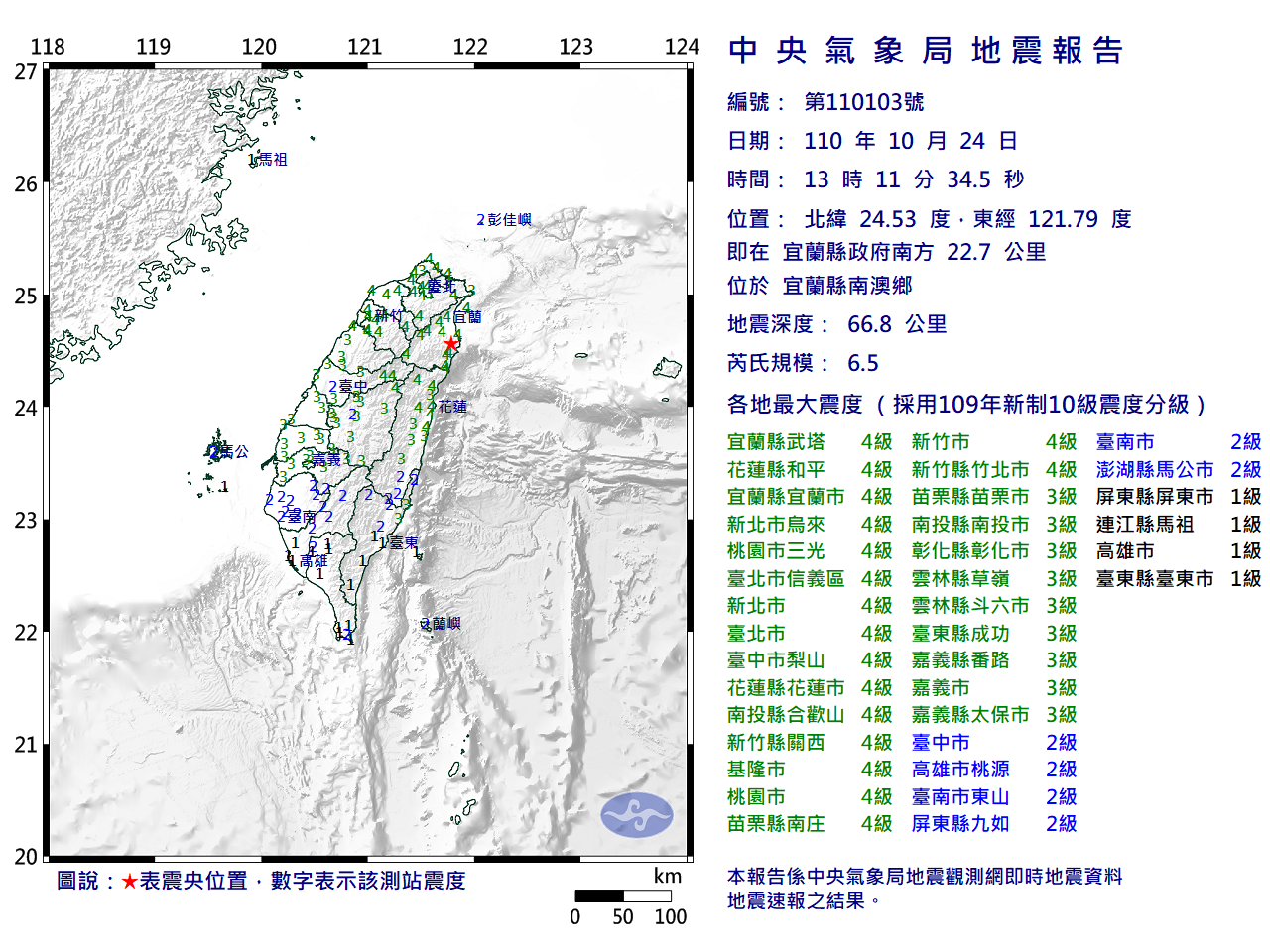 根據中央氣象局資訊,震央分別位於宜蘭南澳及大同鄉,深度為66.8及67.3公里;最大震度宜蘭縣、花蓮縣、新北市、桃園市、台北市、台中市、南投縣、新竹縣、基隆市、苗栗縣、新竹市4級。