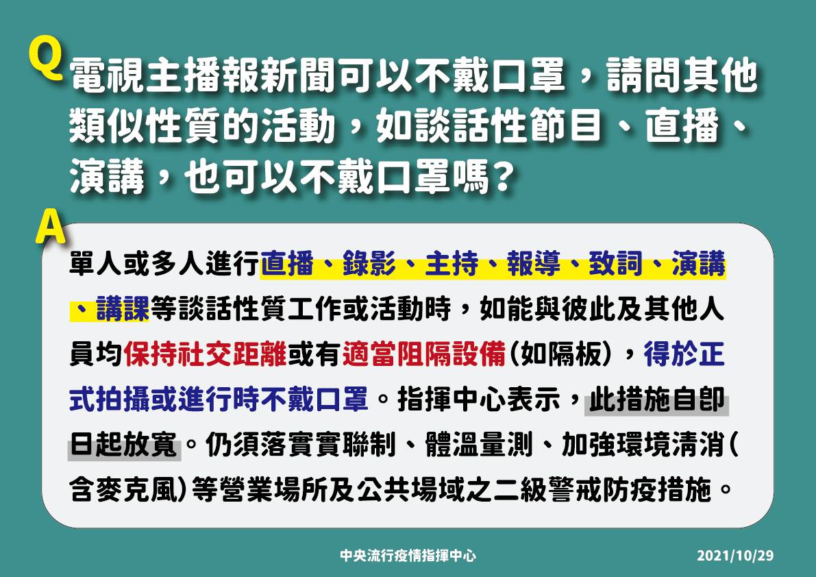 中央流行疫情指揮中心宣布口罩規定再鬆綁,即日起,談話性節目、直播、演講、學校授課等,在可維持社交距離或有隔板狀況下,可不戴口罩。
