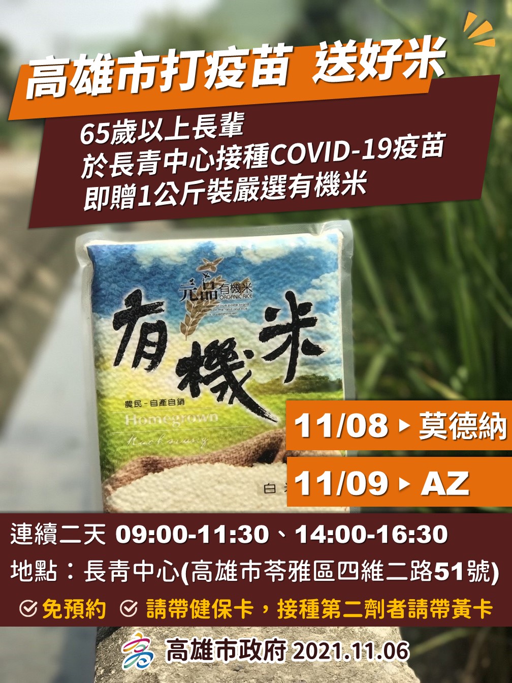 高市府為鼓勵65歲以上長者接種疫苗,長者在11月8日與9日到長青中心接種莫德納(Moderna)或阿斯特捷利康(AstraZeneca)疫苗免預約,還送1公斤裝有機米。