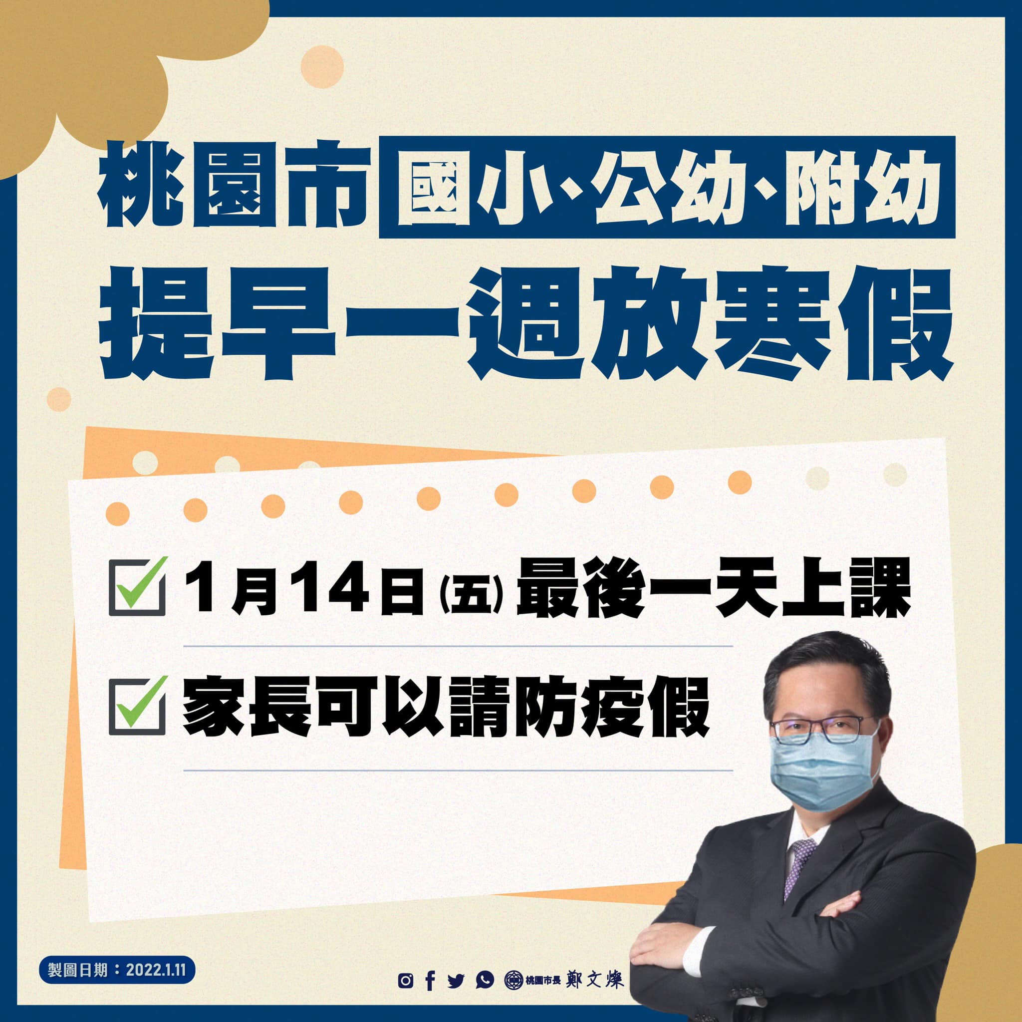 桃園考量已經有3所國小因學生確診要停課到寒假,桃園市公私立國小將提早1週放寒假,14日是最後一天上課;家長可在1月17日至1月20日期間申請防疫照顧假,如家長無力照顧,仍可比照去年三級管制期間,由學校(含幼兒園)安排人力,提供學生到校學習、照顧及用餐。