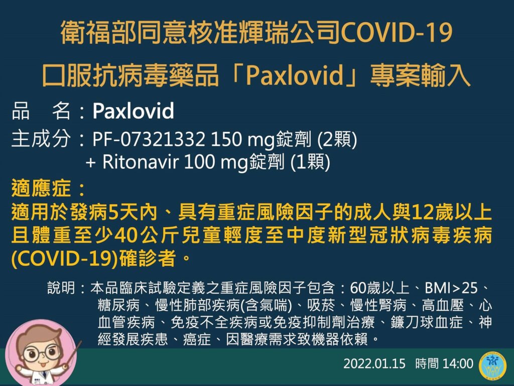 中央流行疫情指揮中心宣布,輝瑞口服抗病毒藥品Paxlovid專案輸入2萬份藥物,首批藥物將在3月前抵台。