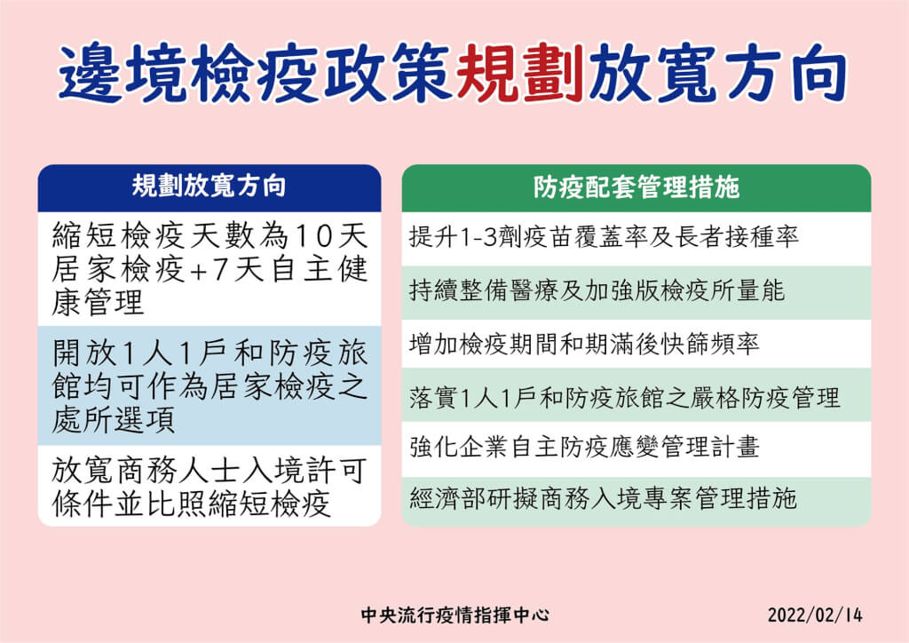 據指揮中心規劃,將縮短居家檢疫天數為10天,以自宅或親友住所1人1戶為原則。PCR檢測入境時及檢疫期滿前(第10天)各1次;檢疫第3天、第5天、第7天以及自主健康管理第6至7天,各執行1次家用快篩,放寬商務人士入境許可條件,並比照縮短檢疫。