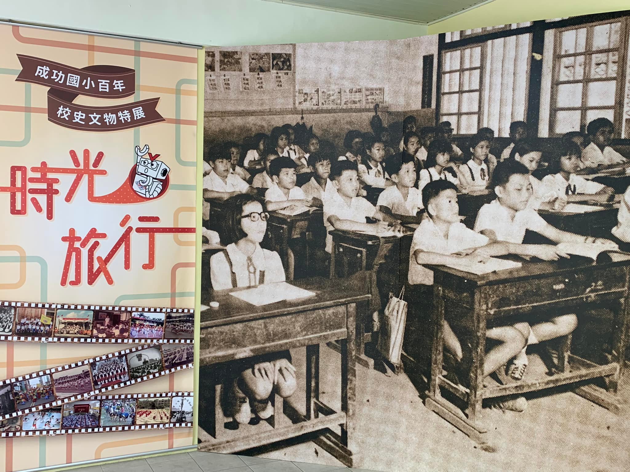 羅東鎮成功國小在1921年(日治大正10年)創校,原訂去年辦理百年校慶活動,受到Covid-19疫情影響而延至今年舉行,「時光旅行」校史打卡牆上大型照片,是羅東成功國小第59屆學生,距今42年前的上課畫面,展場另有日治時期文物簿本、70年歷史的校旗、懷舊老照片、早期運動服裝、歷屆畢業紀念冊。