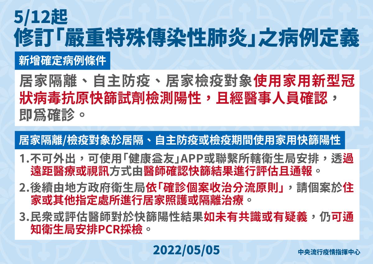 中央流行疫情指揮中心表示,為維持國內的covid-19病例監測及防疫採檢量能,諮詢專家修訂「嚴重特殊傳染性肺炎」之病例定義,新增「居家隔離及自主防疫或居家檢疫期間使用家用新型冠狀病毒抗原快篩試劑檢測陽性,且經醫事人員確認」為確定病例條件,並自5月12日起實施。