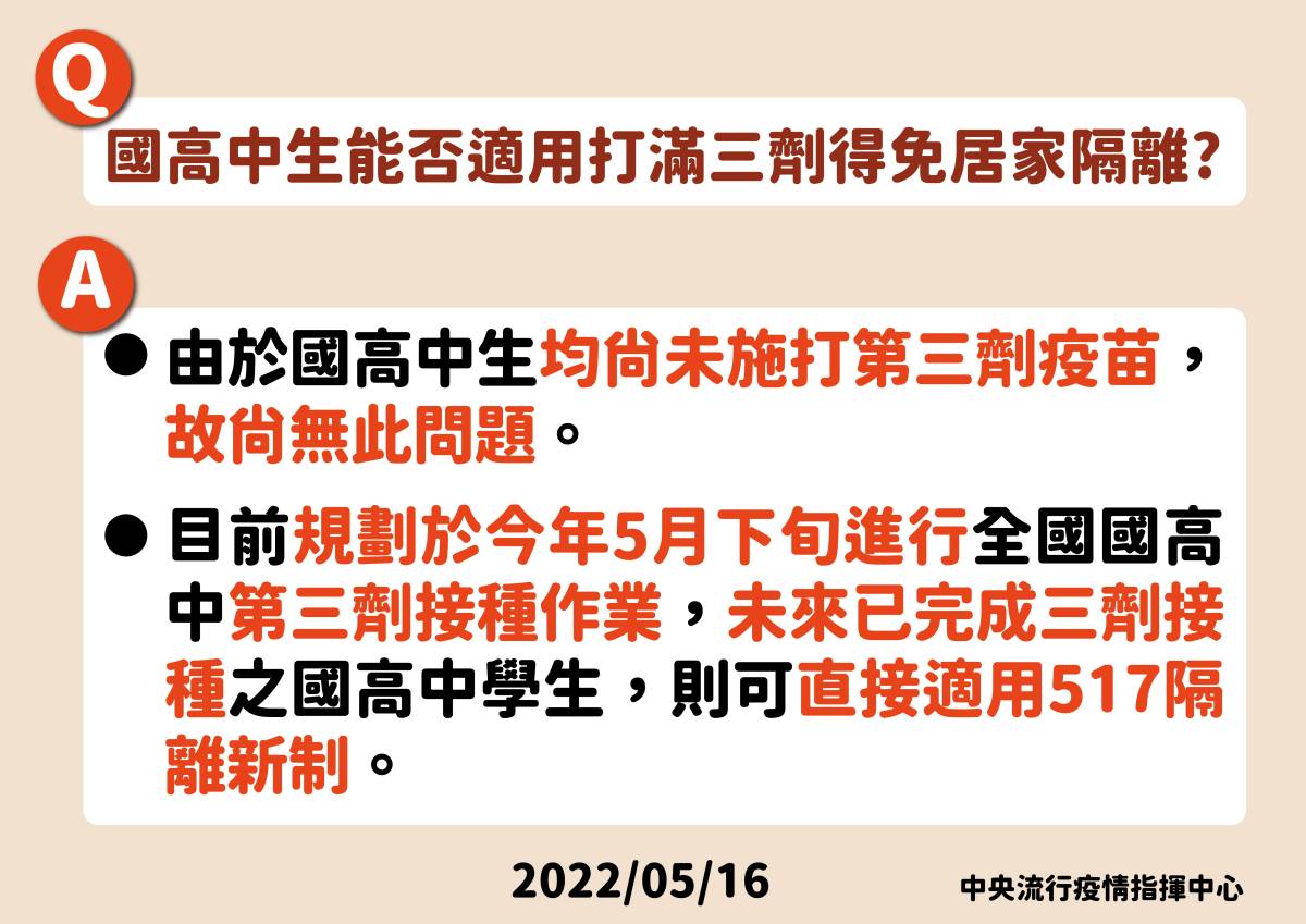 自5月17日起,中央流行疫情指揮中心更改防疫規則,COVID-19確診個案同住家人已完成3劑疫苗接種者,可免居家隔離,改進行7天自主防疫。有民眾疑問,那國高中生是否適用517隔離新制呢?