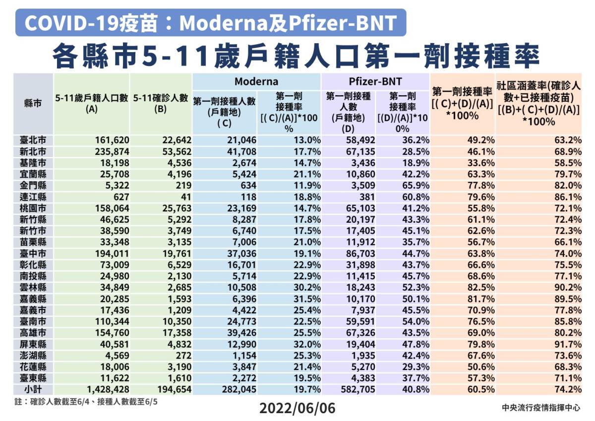根據中央流行疫情指揮中心統計,接種第1劑輝瑞兒童疫苗人數加上兒童莫德納疫苗第1劑人數,除以各縣市5至11歲戶籍人口計算,全國5至11歲戶籍人口第1劑接種率已達60.5%,加上該年齡層確診人數計算,全國5至11歲兒童社區涵蓋率已達74.2%,簡而言之,就是這個族群保護力已超過7成。