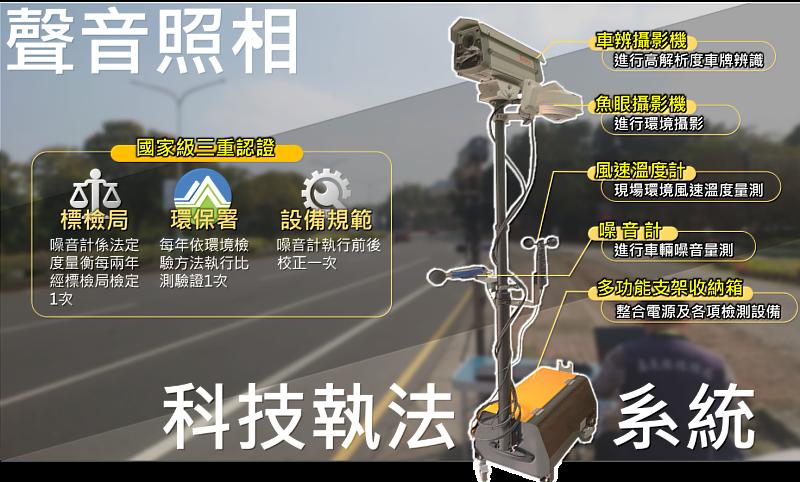 嘉義縣環保局為遏阻車輛噪音妨礙安寧,導入科技執法聲音照相科技執法系統,將車牌辨識系統結合噪音計,監控行駛中車輛噪音並即時蒐證及舉發!