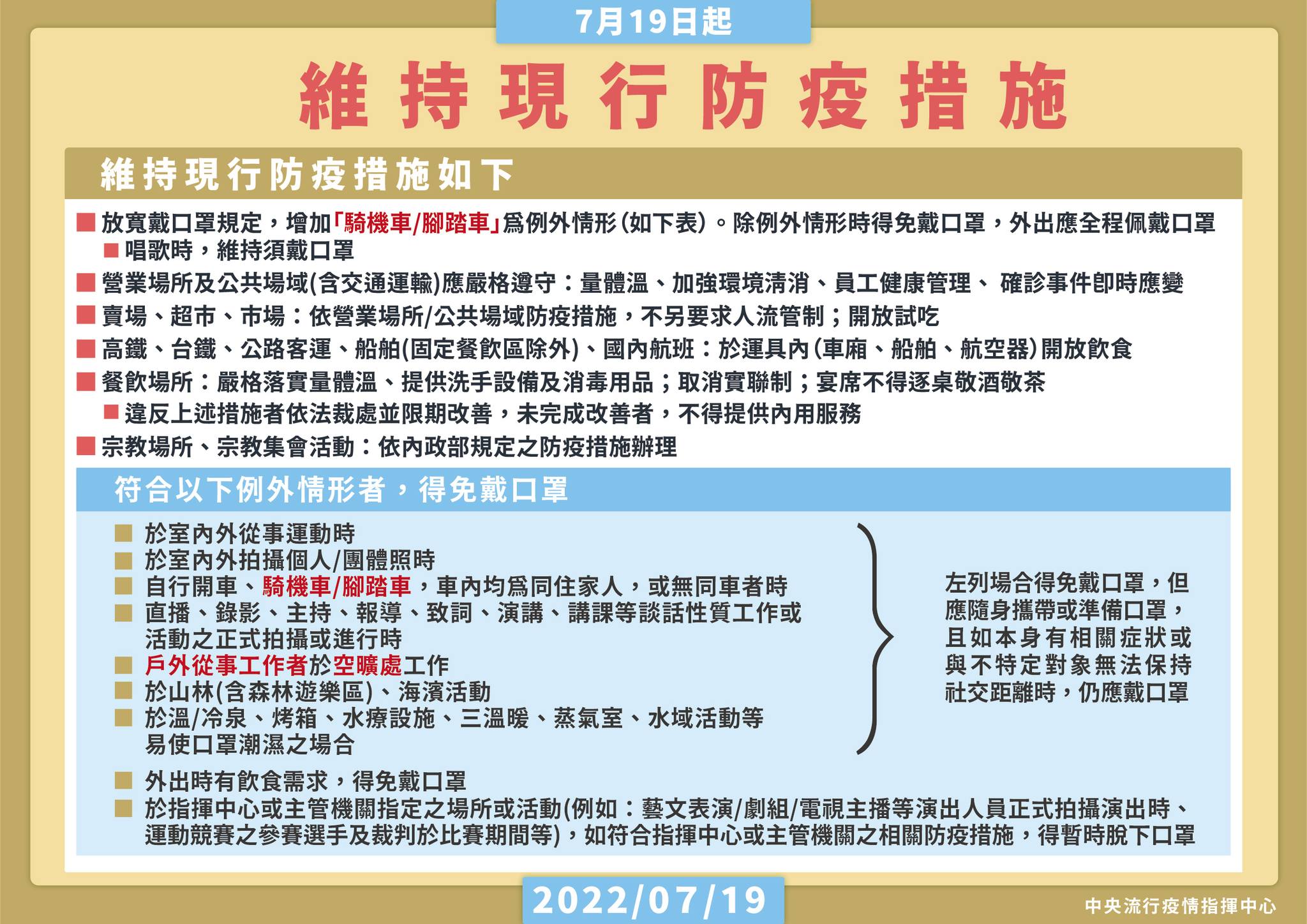 中央流行疫情指揮中心19日宣布,經綜合評估疫情情勢,7月19日起適度放寬戴口罩等防疫措施,其中放寬「騎機車/腳踏車」及戶外從事工作者於空曠處工作得免戴口罩,而指揮官王必勝表示,散步也是一種運動,可免戴口罩。相關規定說明如下: