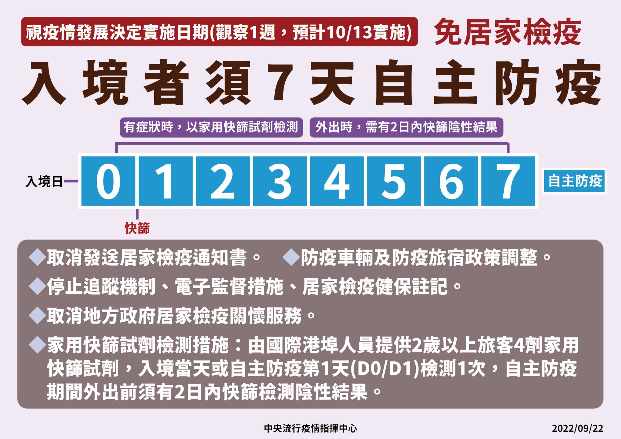 中央流行疫情指揮中心表示,入境居家檢疫措施採兩階段方式調整,觀察1週後,第一階段為自今(2022)年9月29日零時起(航班表定抵臺時間)調整前3天居家檢疫處所為「1人1室」;第二階段將視疫情發展,適時放寬入境人員免居家檢疫,改採7天自主防疫,預計在10月13日實施。相關規劃調整如下: