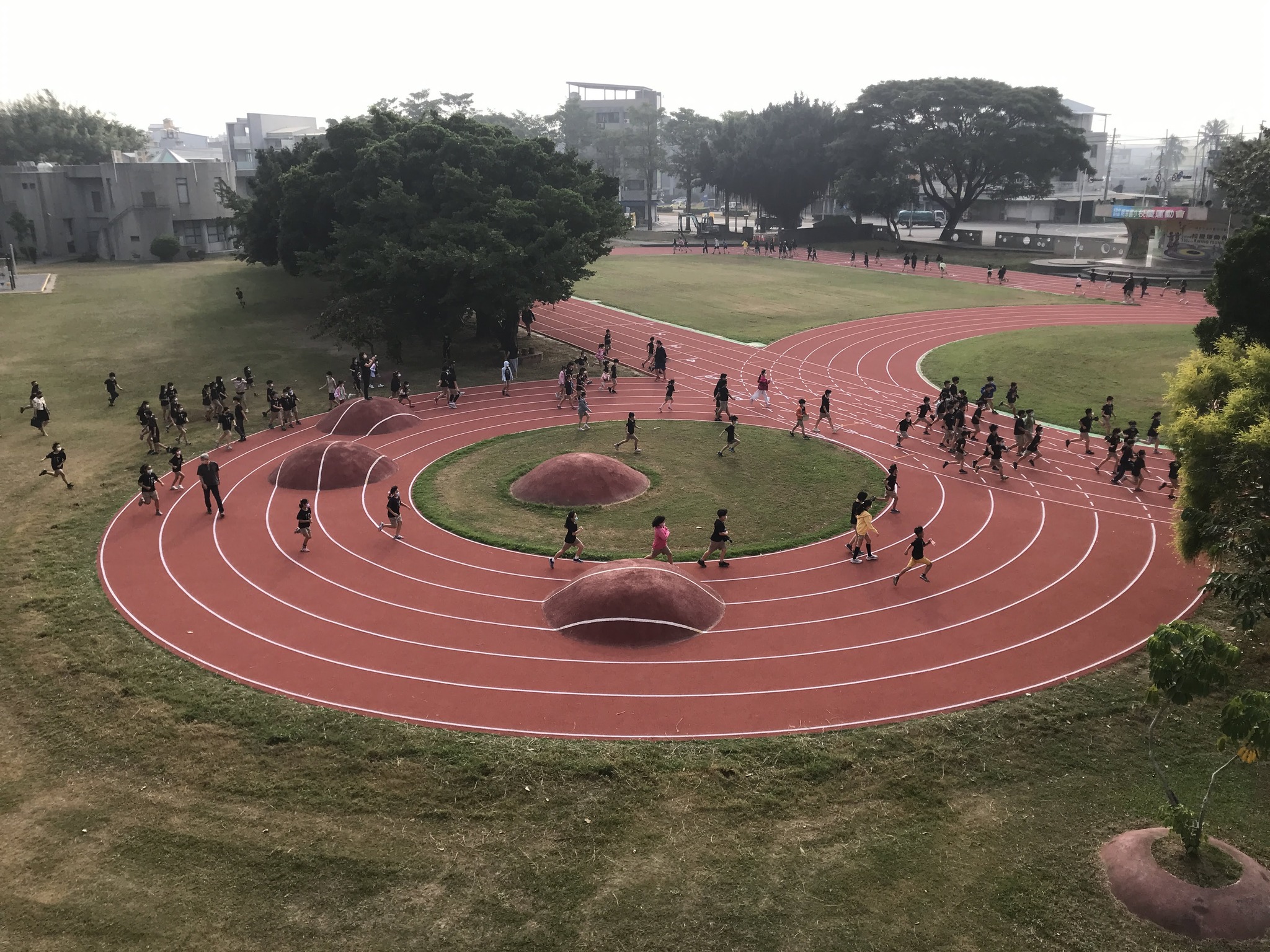 校方證實這是新建的「冰淇淋跑道」,打造一個可以當遊樂場的操場,讓孩子可以爬坡、可以捉迷藏,操場分兩個區塊,一邊是標準操場,範圍較小的是創意的冰淇淋跑道,由「0」與「8」造型結合而成的PU跑道,再融入五顆狀似冰淇淋的半圓球體,分布其間,造型首創,世界唯一!