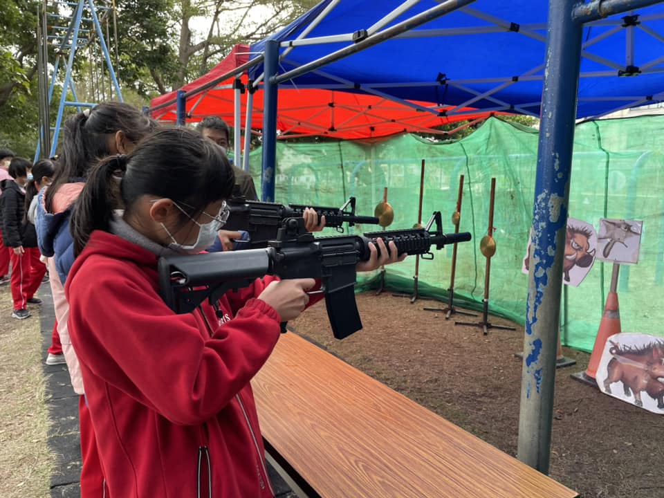 大秀國小配合全民國防教育,讓學童認識基本的國防知識,在學校就能體驗漆彈射擊,透過任務模擬、限制空間戰鬥等多種玩法安排分組的實際對戰,考驗團隊合作默契。