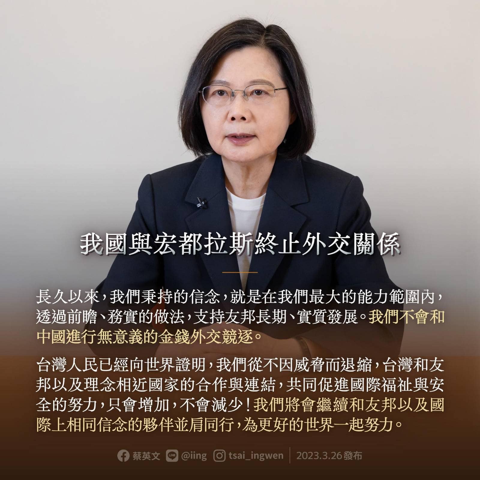 宏都拉斯現任總統卡斯楚(Xiomara Castro)於2021年總統大選期間,已經表明想要改向中國建交,而外交部長吳釗燮披露,在斷交前收到宏都拉斯外交部長的信件,要求台灣提供9000萬美元興建醫院、蓋水壩要3億5000萬美元,另外也希望台灣償還20億美元國債,上述三項加總共24.5億美元要台灣協助。