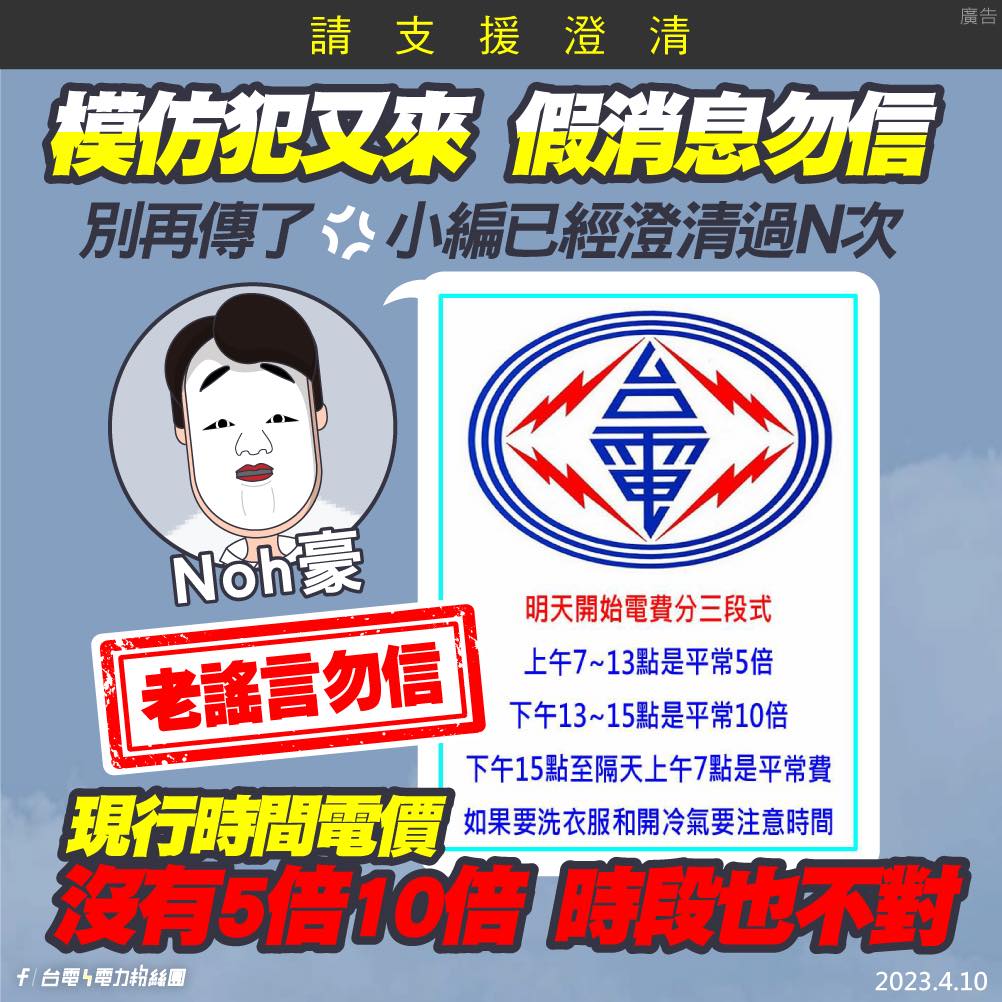 對此,台電的官方臉書粉絲團發文指出,澄清圖片上的消息是假的,呼籲廣大網友「支援澄清」。小編表示,這張圖片幾乎每年都會出現一次,強調這是假的,已經多次澄清過,希望大家不要再轉傳。