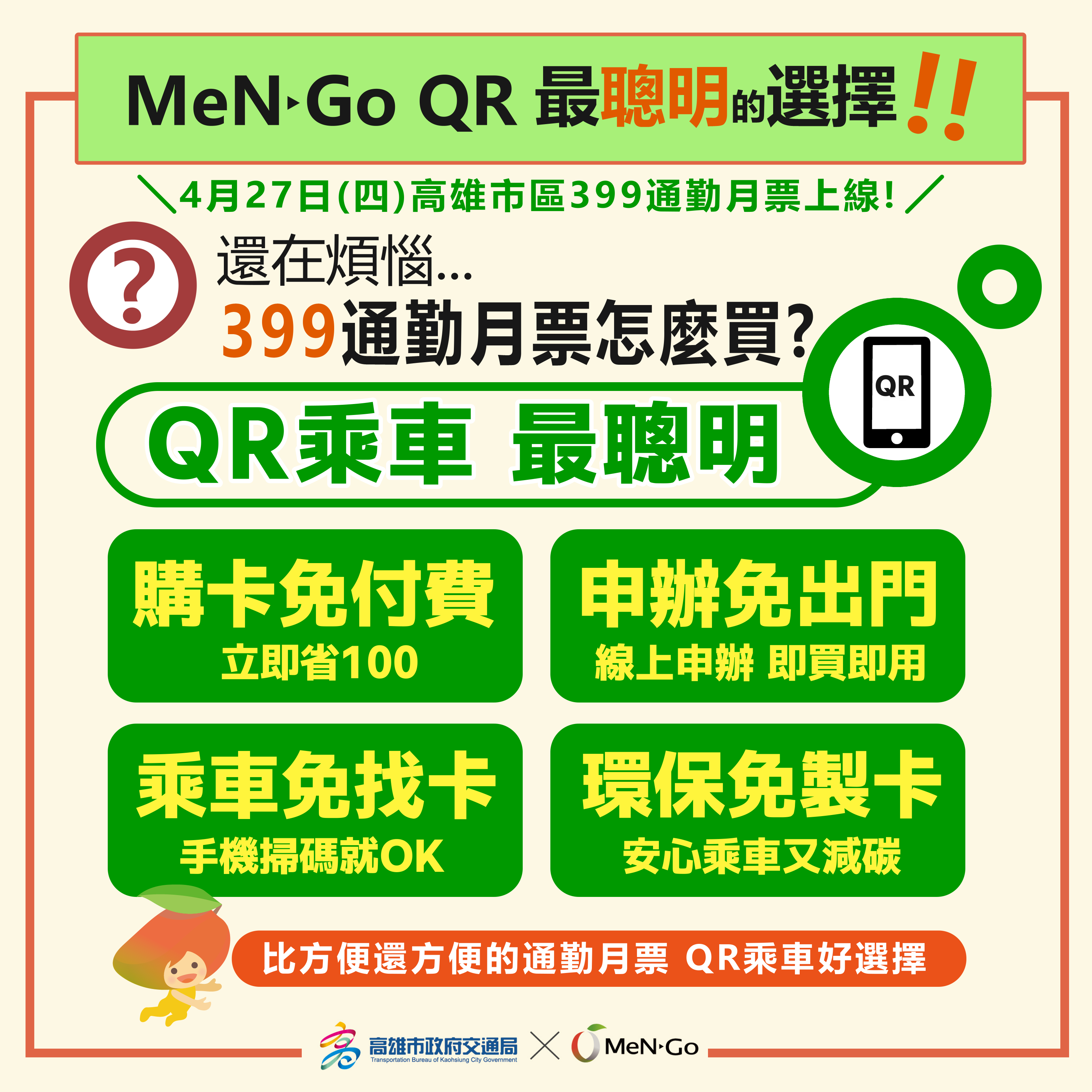 高雄交通局為便利民眾可以即買即用並避免卡片遺失困擾,在110年完成市區公車及所有公共運輸系統QR驗票機建置,MeNGo月票採用QR虛擬卡的使用者持續增加,目前佔50%。399月票交通局維持提供QR碼與實體卡供民眾選擇。