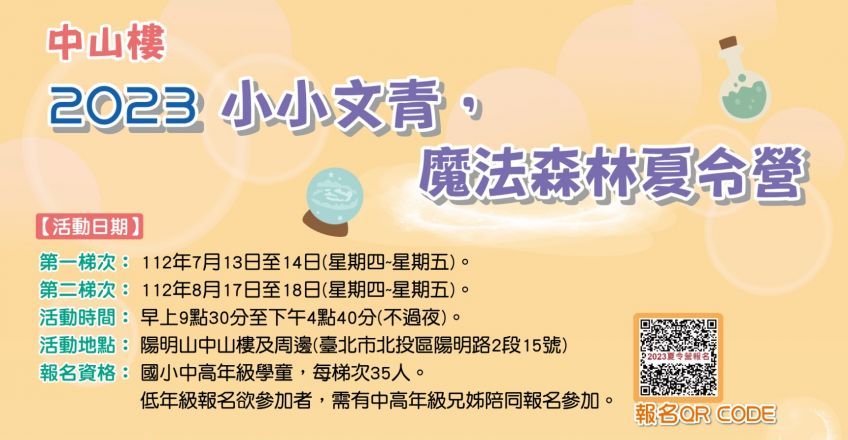 中山樓精彩的人文歷史及豐富的自然生態,是小朋友暑假期間自我成長學習的最佳天然教室。親愛的家長們,暑假為您的小寶貝安排一趟兼具人文、生態及科學之旅,讓小朋友們在自然的環境下,學習新知及培養學習感知能力。心動不如馬上行動,歡迎喜愛陽明山中山樓的家長們為您的小寶貝立即報名!