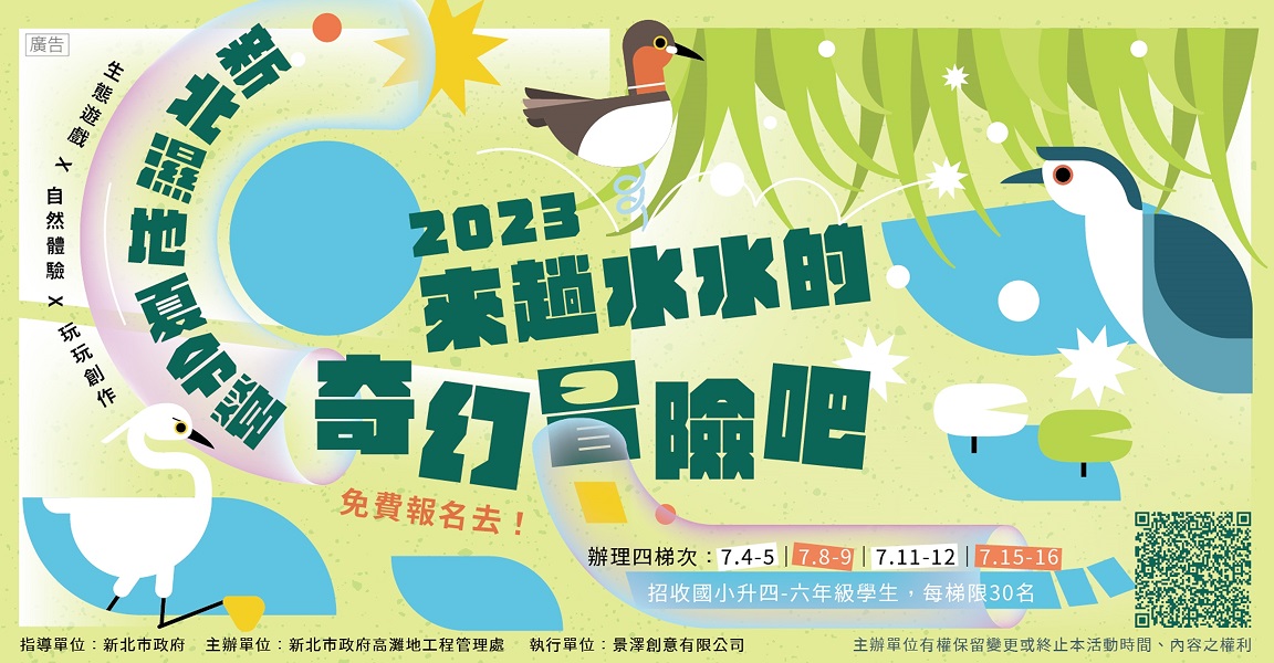 2023新北濕地夏令營又來囉,活動將於6/6中午12點準時開放免費報名,趕快來幫家中的寶貝報名,讓暑假天天都精彩。生態遊戲、自然體驗、玩玩創作,學校裡看不到的有趣生態課程都在這,邀請國小四~六年級學童一起玩暑假。