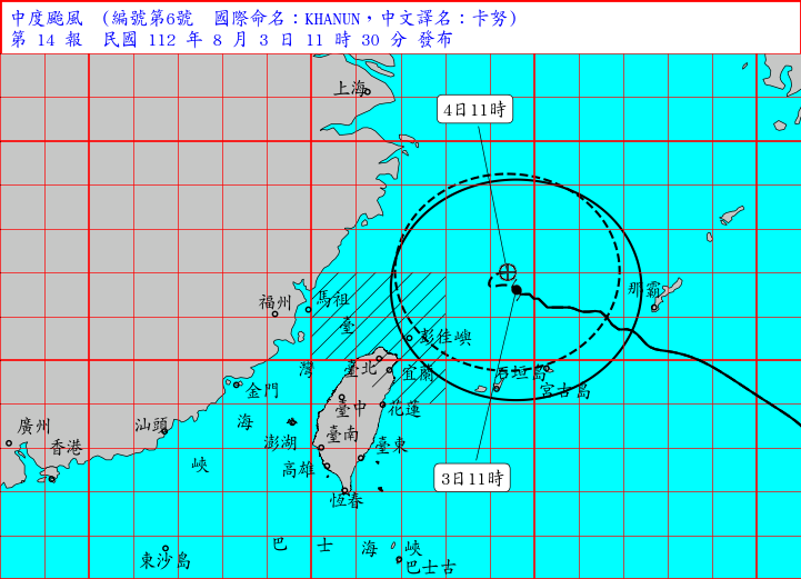 氣象局新增台北市為颱風卡努陸上警戒範圍。由於卡努移動速度緩慢,預計未來仍會緩慢往西北西方向移動,目前中心位置仍然在琉球一帶。整個3日,卡努仍會緩慢接近台灣,暴風範圍可能會影響台灣陸地。
