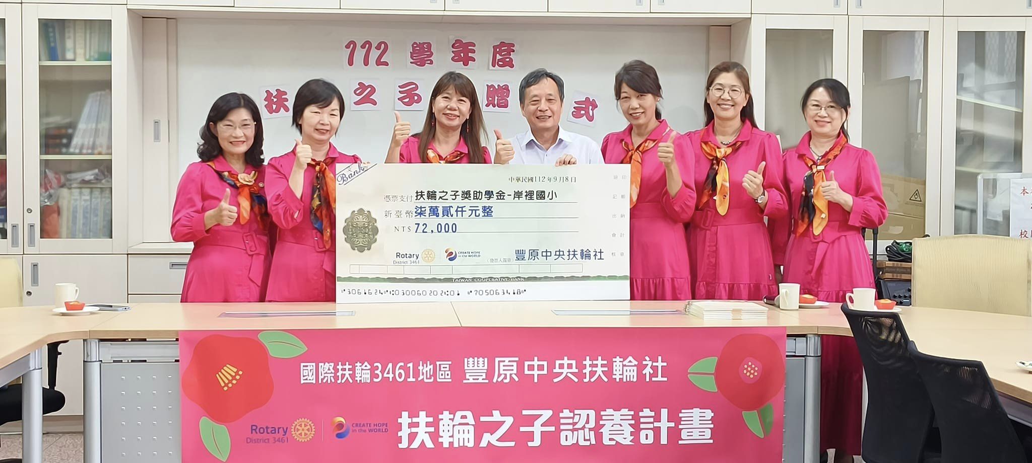 台中市神岡區岸裡國小與豐原中央扶輪社攜手合作,展開了一項名為「扶輪之子認養計劃」的卓越計畫。該計畫的核心目標是挑選出六位學業或才藝優秀但家境困難的孩童,提供他們經濟支援,確保他們不因環境因素而被迫中斷學業。具體來說,豐原中央扶輪社的六位社友慷慨解囊,捐贈總額達72,000元的助學金,鼓勵這些孩子持續追求知識,同時減輕了其家庭的經濟負擔。
