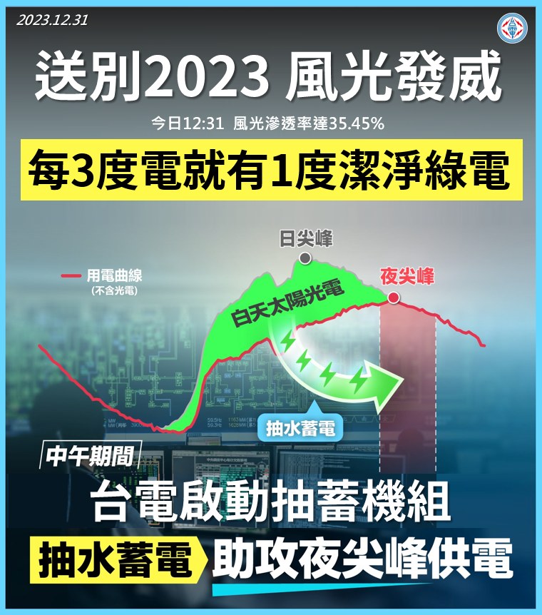 在2023年的最後一天,台灣的再生能源發展再寫歷史,風光發電滲透率達到35.45%,代表每3度電中,至少有1度來自潔淨的綠色能源。再生能源已經不僅僅是電力供應要角,同時也讓抽蓄機組在白天有更多的時間進行儲能。此外,也使得火力發電能夠保持較低的發電量,進一步減少碳排放,同時優化了在空氣污染嚴重的季節中的電力調度模式。