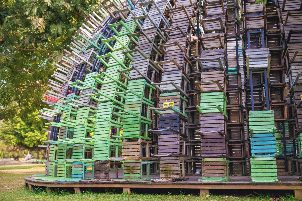 高雄市文化局解釋,「椅子樂譜」是由藝術家顏名宏創作,結合了1000多張來自高雄市各國中小學的淘汰課椅,搭建成雙層半球體的藝術品,是駁二藝術特區中受歡迎的拍照勝地。