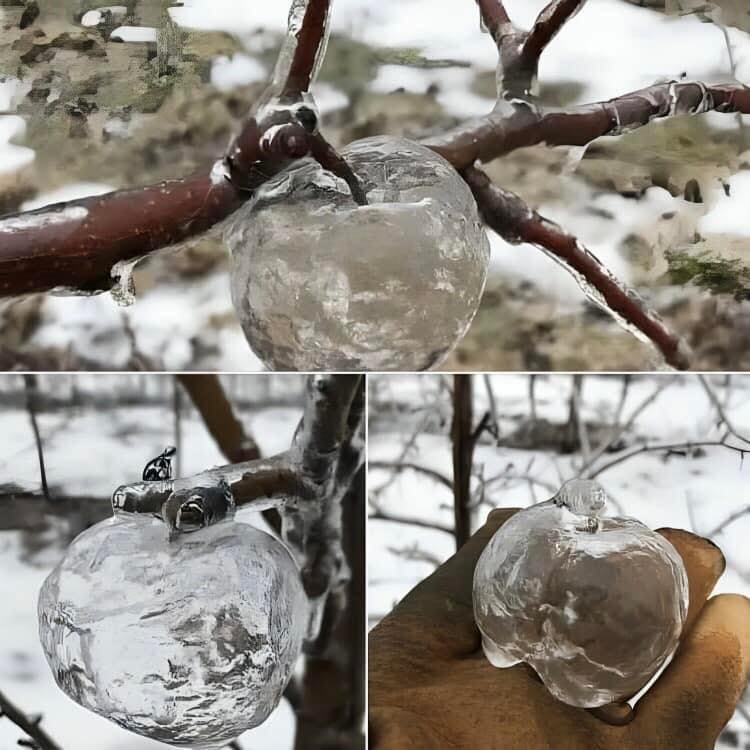 加拿大一家做樹木保護、園藝服務和樹苗培育的公司,「草原防護林計畫」(Prairie Shelterbelt Program),最近在社交媒體上分享了一系列自然形成的「透明冰蘋果」照片,這是怎麼回事?為什麼蘋果樹會長出透明的冰蘋果?