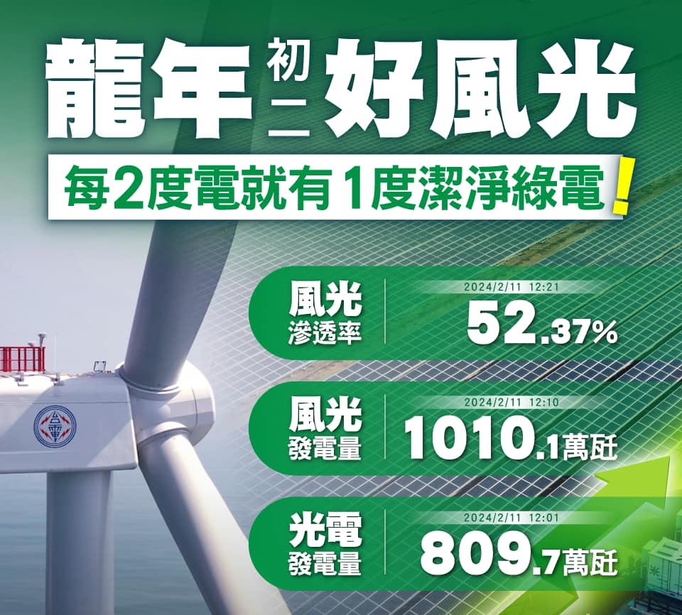 台電指出,去年春節期間,風力和太陽能發電的滲透率才首次超過了30%,而今年已經增長到了超過50%。這種增長不僅是因為農曆新年期間用電量較低,還因為政府和民間近年來在推動再生能源方面的努力,使得風力和太陽能發展成果逐漸浮現並持續擴大。