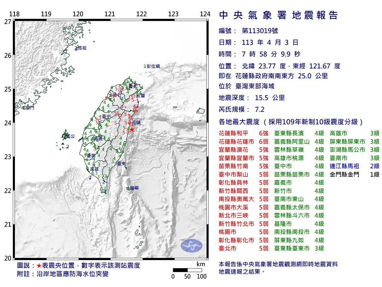 中央氣象署地震中心表示,這是繼25年前的921大地震以來(規模7.3)最大地震,未來3天仍可能發生6.5以上地震,呼籲民眾注意。
