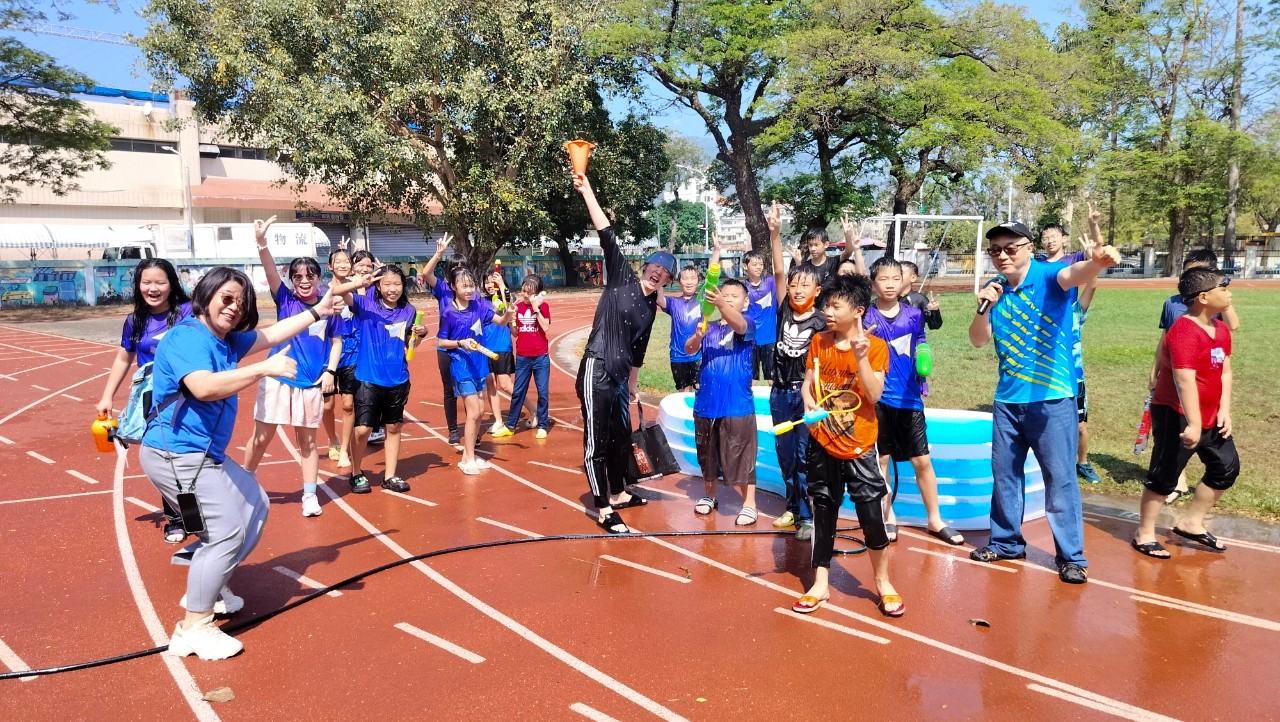 高雄市三民區河濱國小完成歷屆小市長的政見,在兒童節前夕於草地操場為學生們準備了潑水童樂會,孩子們自備的水槍或容器,人人先潑為敬,大小孩子們都玩的不亦樂乎。