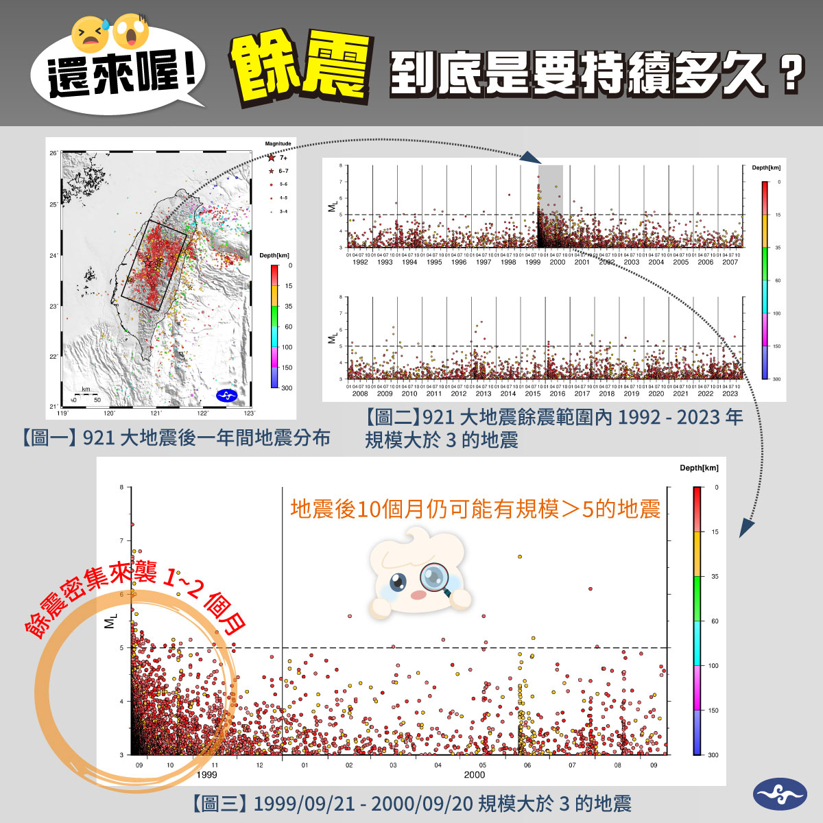 根據氣象署資料庫顯示,921大地震後一整年有超過五千次規模三以上的地震,而在921大地震之前一年僅出現944個,頻率增加超過五倍。
