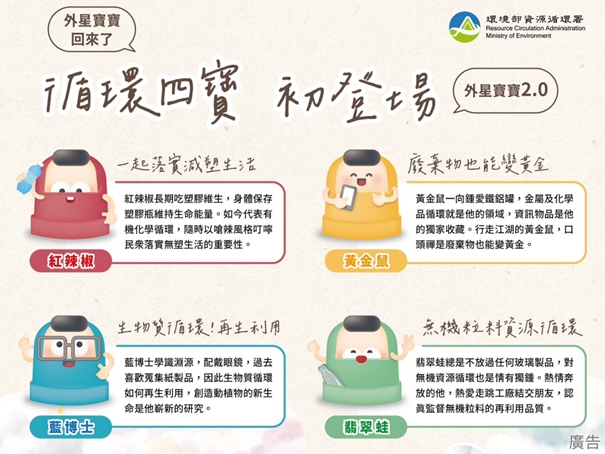 現在,環境部又推出了新的「外星寶寶2.0」吉祥物,叫做「循環四寶」,它們有新的形象,還是分成紅、黃、藍、綠四種顏色,分別對應回收塑膠、鐵鋁罐、紙類和玻璃瓶。這次,他們希望用這些新的「外星寶寶」吉祥物來提醒大家繼續做資源回收,讓我們的環境變得更好、更乾淨;此外,因為現在的資源回收或垃圾桶都已經有更細項的圖示,不會再還原實體的外星寶寶垃圾桶。
