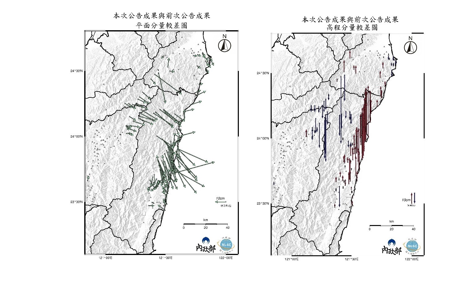 地震之後,內政部為了確保我們的地圖和測量數據是準確的,就用衛星導航系統(GNSS)來重新測量這些地點。他們比較了地震前後的數據,發現有些地方的座標變動非常明顯。比如說,在地震後的一段時間內,花蓮地區的水平位移達到32.7公分,而壽豐站的地面抬升了39.3公分。測量範圍從宜蘭縣的三星鄉到花蓮縣的豐濱,還有南投縣的埔里鎮到台灣的東海岸,共檢測了247個點,其中有138個點的座標變動有顯著差異。