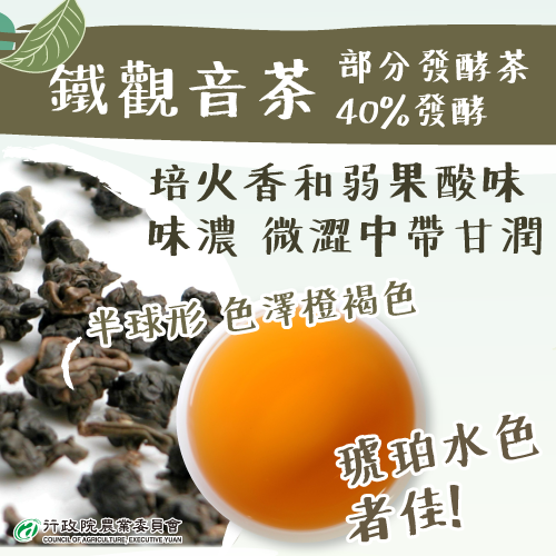 鐵觀音這個名字,其實是來自一種茶樹的品種。因為這種茶樹適合製作烏龍茶,所以茶也叫做鐵觀音。在台灣,鐵觀音指的是用特定的方式製作的烏龍茶,雖然原料不一定非得是鐵觀音品種的茶葉。這種茶通常的發酵程度在40%到50%之間,所以它是一種半發酵茶。