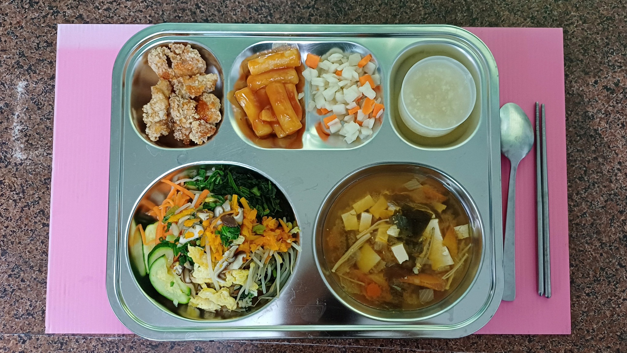 當天,學校還舉辦了一場特別的表演活動。同學們在朝會上用歌唱、舞蹈和介紹的方式,分享韓國菜的特色,讓大家對這些美食有更多的了解。這些韓式佳餚也被做成展示,貼在校園裡,增添了國際化的氣氛。午餐時間,全校師生一起用韓國直送的不鏽鋼餐盤品嚐這些菜餚,讓整個校園充滿了異國情調,同學們都覺得很新奇又有趣。