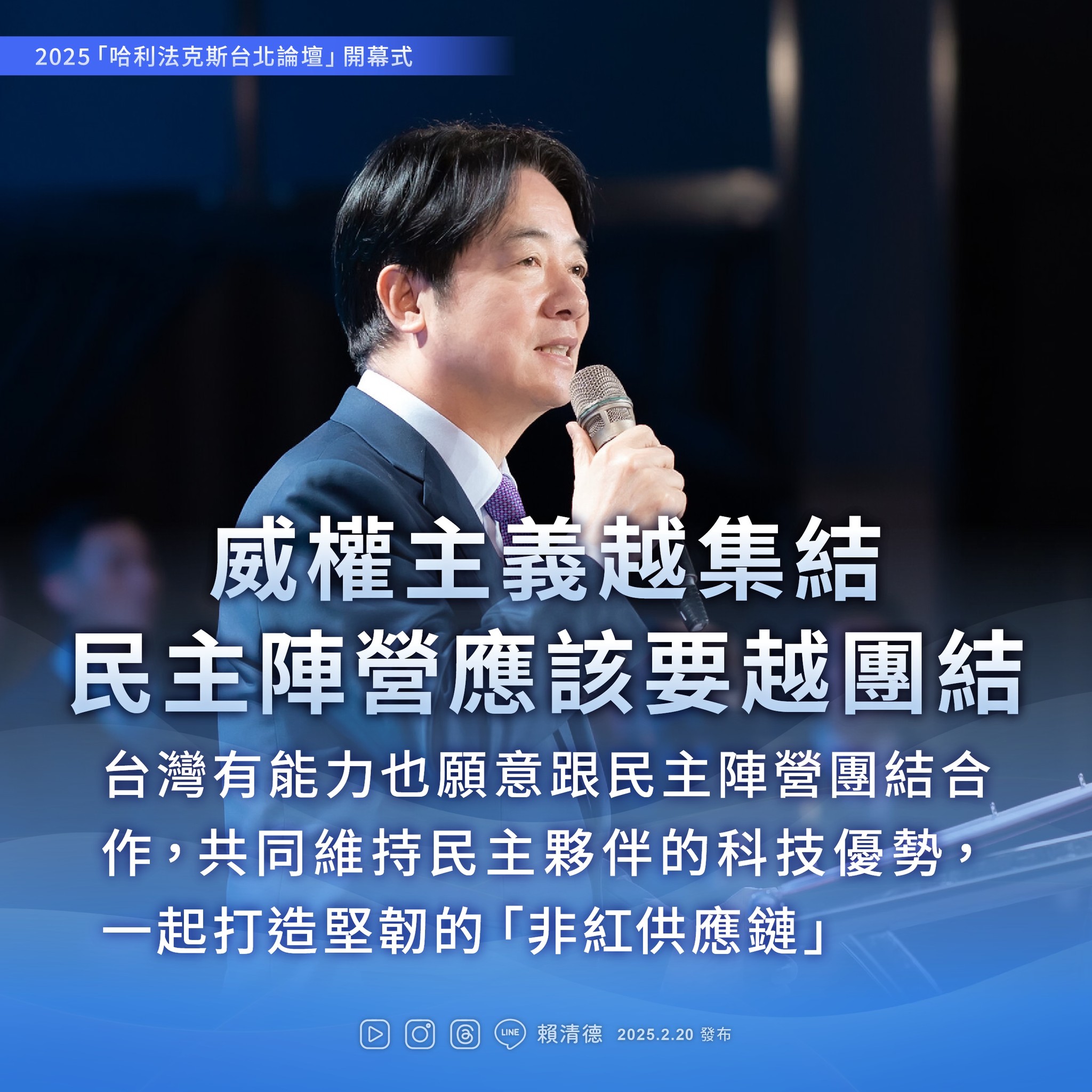 在論壇上,總統賴清德提出三個重要的呼籲。首先,他強調當威權國家聯合起來時,民主國家更應該團結合作,像美國、日本和韓國就一起討論如何保護台灣的和平與安全。其次,他提到要建立「非紅供應鏈」,這是指民主國家要合作生產重要的科技產品,避免過度依賴可能帶來威脅的國家。最後,他希望大家能團結一致,讓世界恢復和平,不被戰爭和衝突所困擾。