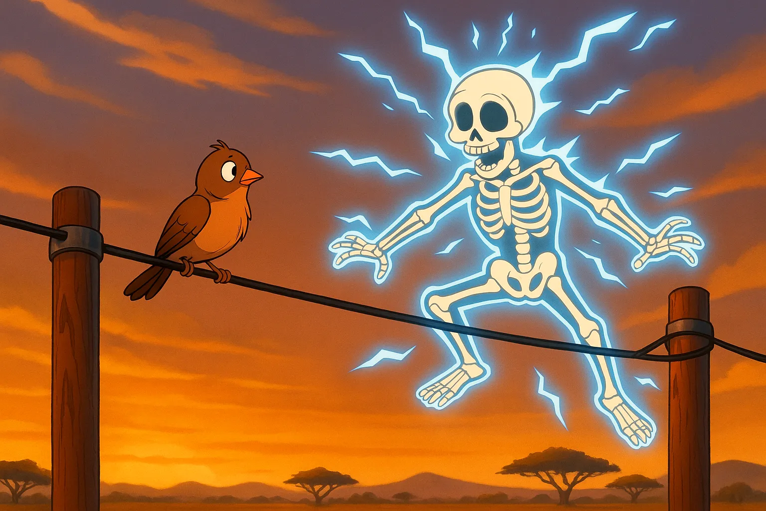 鳥的體型小、站位集中、沒碰到地面,讓牠們安全。人類體積大、接地、容易跨越不同電位,結局就是——被電成漫畫角色那樣焦黑冒煙。所以拜託,下次看到鳥站電線時,就拍拍手說:「哇~好厲害」,千萬別心生模仿,除非你想瞬間變「烤全人」😅。
