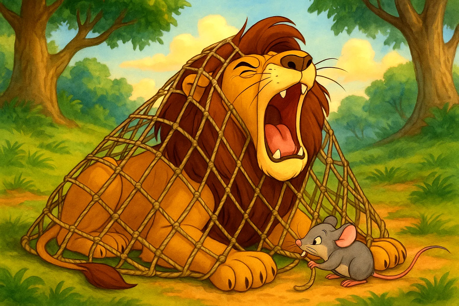 過了幾天,獅子在森林裡走路時,不小心踩到了一個獵人設下的陷阱,整個身子被大網子困住了。牠用力掙扎,可是越掙扎,網子拉得越緊,獅子又累又氣,大聲吼叫:「救命啊!有誰可以幫我!」