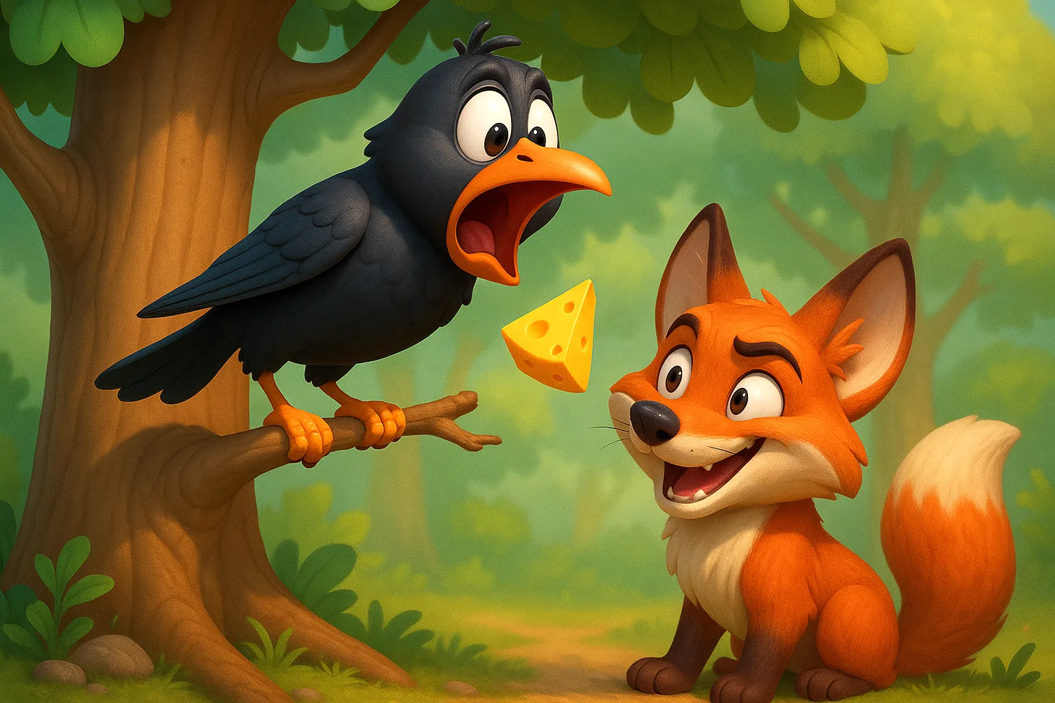 烏鴉一聽,被誇得心花怒放,想:「哼哼,我的聲音真的這麼動聽嗎?那我得唱給牠聽聽!」於是她一張嘴:「啊——」結果,嘴裡的起司就「啪!」地掉下來了!