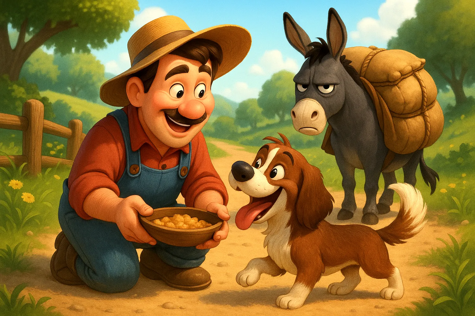 有一天,一個農夫帶著自己的驢子和小狗一起出門。農夫走在前面,驢子馱著重重的行李,狗則輕鬆地在旁邊蹦蹦跳跳。