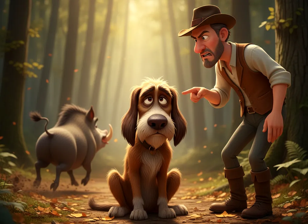 獵人看見這一幕,非常生氣,大聲責罵牠:「沒用的東西!你怎麼連一隻野豬都抓不住?」