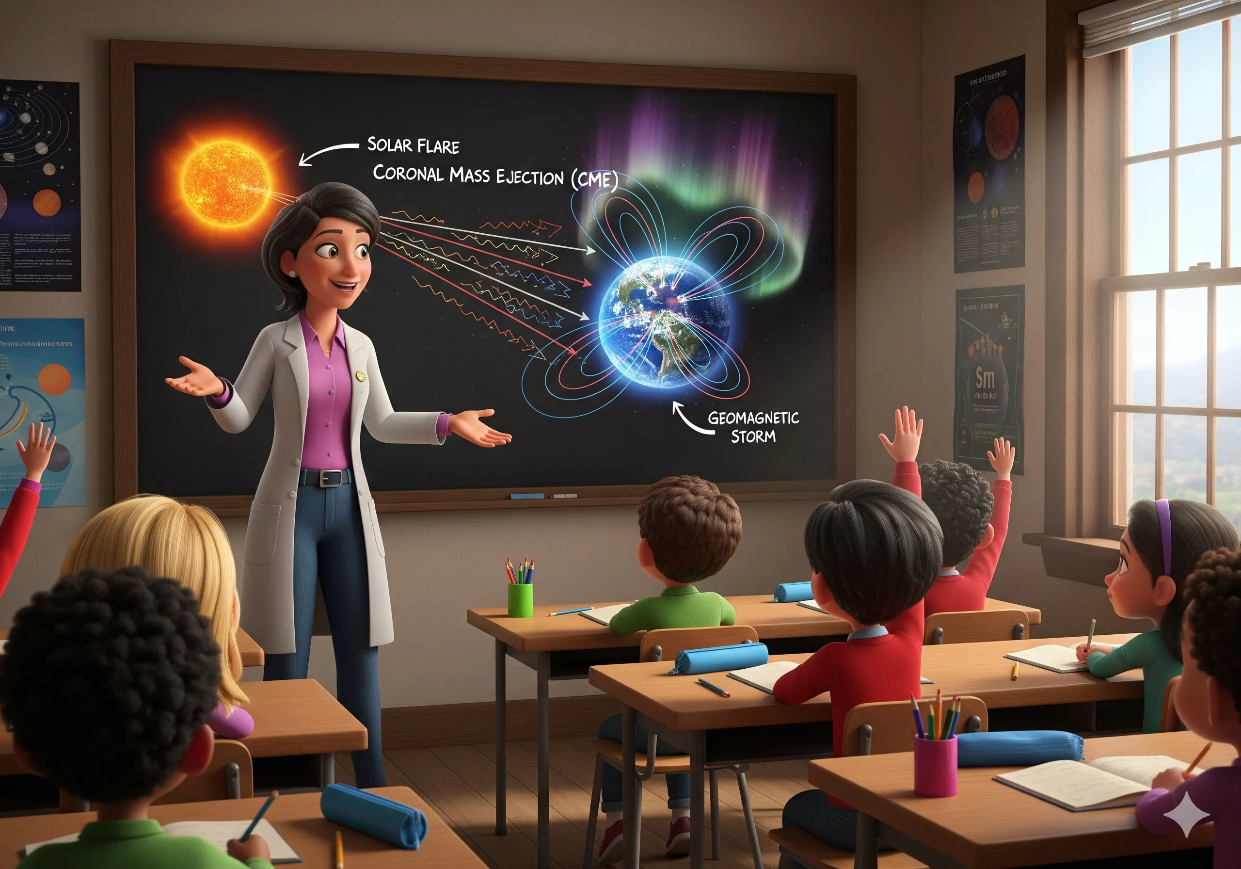 太陽其實跟人一樣,有時候也會「打噴嚏」。太陽的噴嚏不是口水,而是一種叫做「太陽風」的東西,裡面有好多好多看不見的帶電小粒子。當太陽打了一個很大的噴嚏,這些粒子就會像一陣風一樣,咻~地衝向地球;根據氣象署的資訊,9月2日凌晨起,會有一個最長持續24小時的「中度磁暴」(G3)等級襲擊地球。