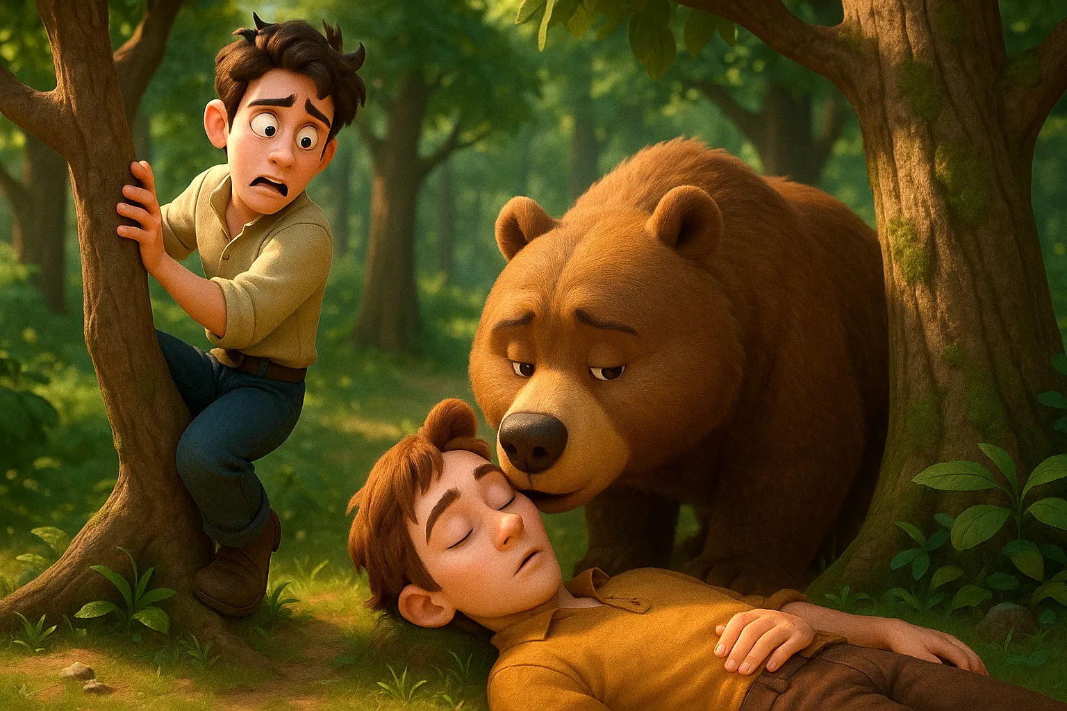 其中一個人動作很快,立刻爬上一棵大樹,把自己藏在高高的樹枝上。另一個人不會爬樹,只好趕緊趴在地上,一動也不動,假裝自己死了,連呼吸都盡量放得很輕。