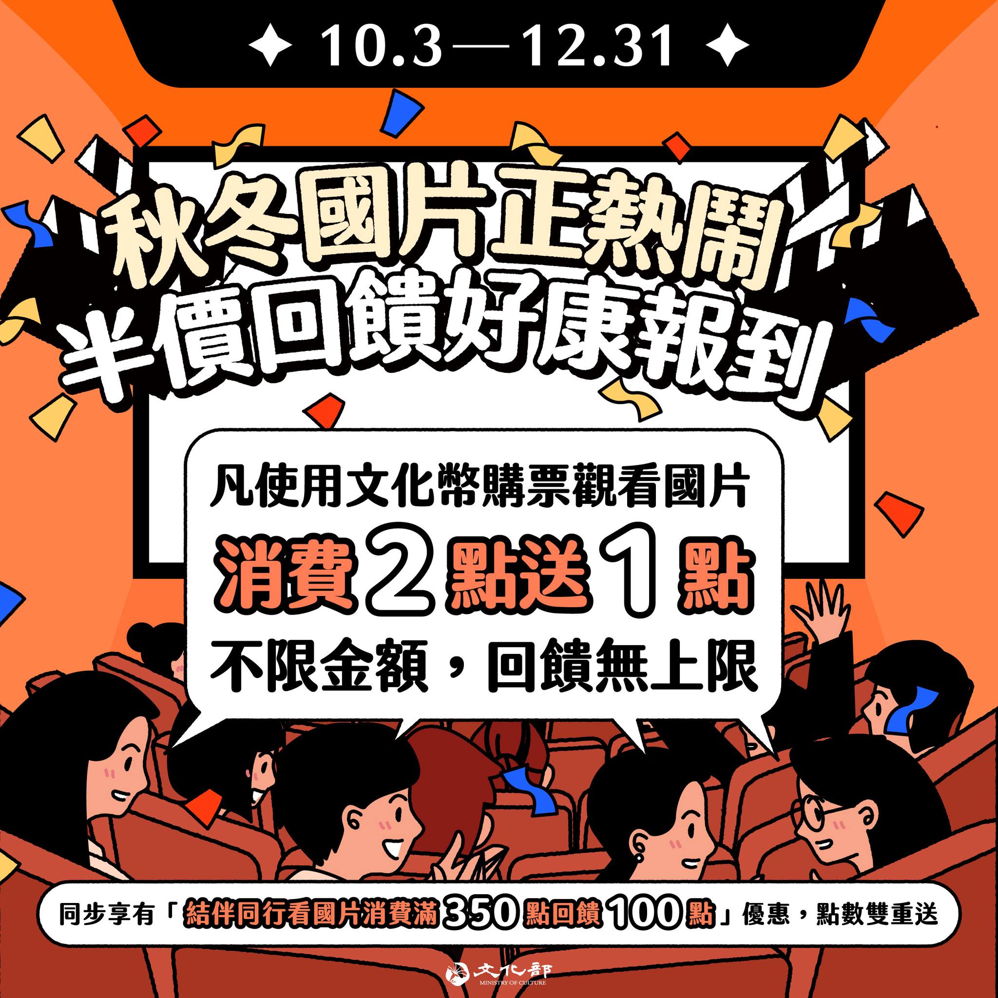 現在文化部有個好康的消息:從10月3日到12月31日,如果用文化幣去買台灣電影的票,每花2點,就會送你1點回來。簡單說,就是差不多可以「半價看國片」啦!