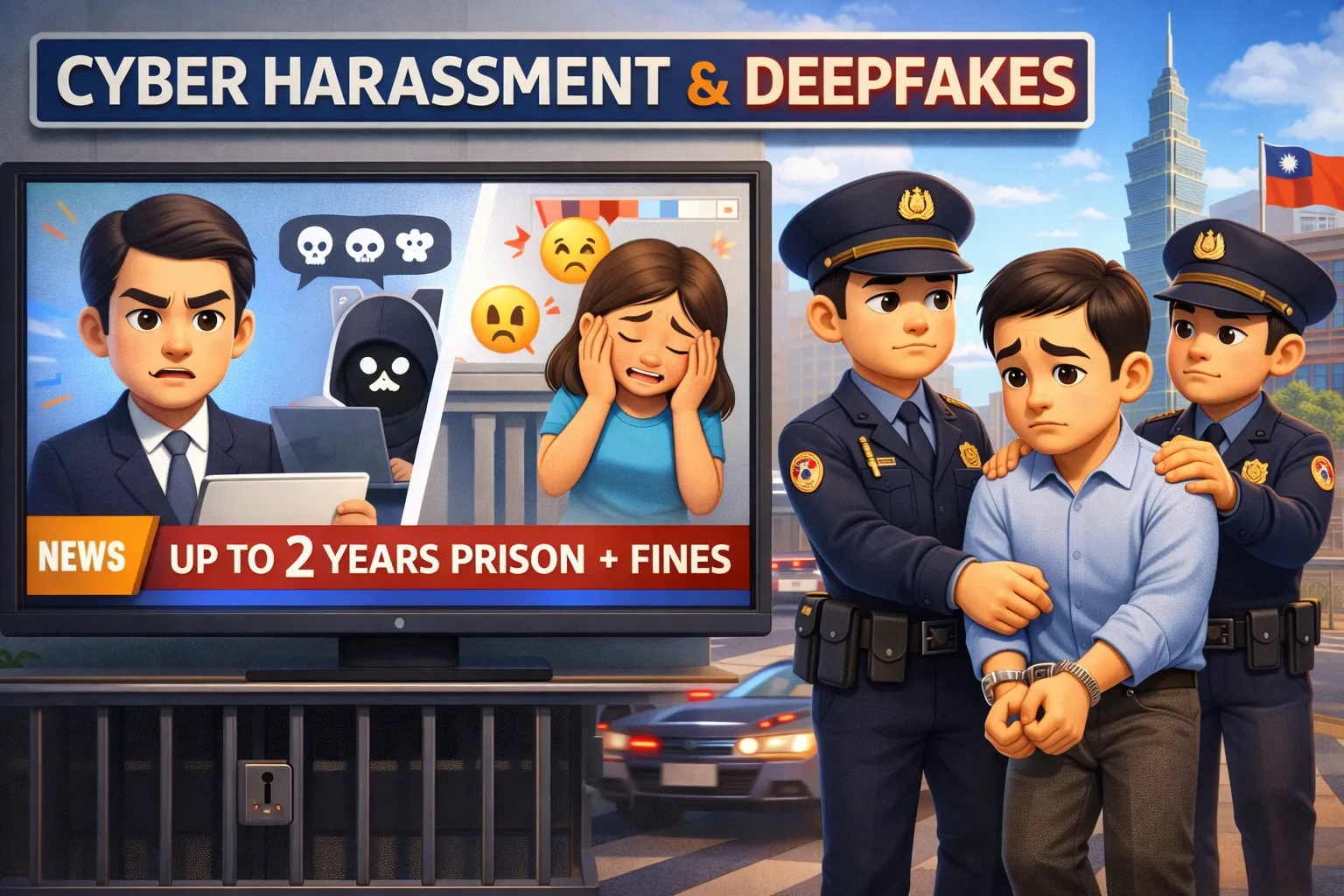 在網路上亂罵人、做假影片害人,會被罰更重了!最近政府發現一件很嚴重的事:有些人會在網路上亂罵人,甚至用電腦做出「看起來很真、其實是假的影片或聲音」(這叫做深偽),讓別人被誤會、被嘲笑,名聲變得很不好。所以,政府決定要改刑法,保護大家不被亂欺負。那,什麼行為會被罰?