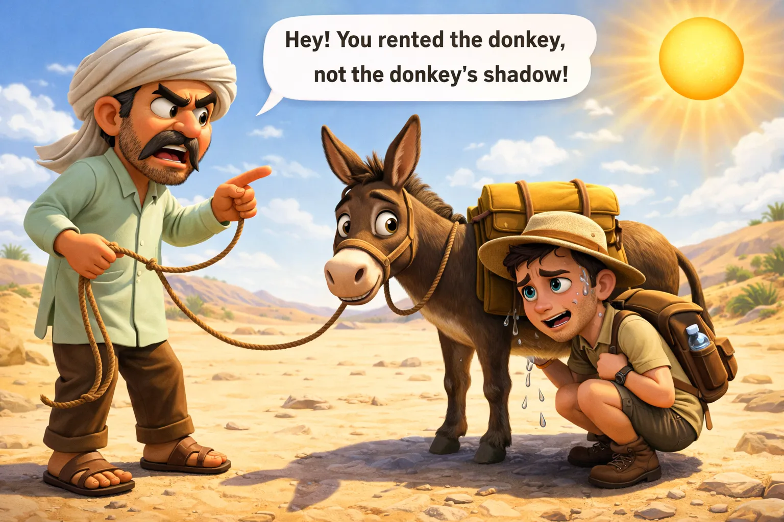 走到中午時,太陽正好掛在頭頂,連風都懶得吹。旅人累得快要站不住,看見驢子身旁有一小塊陰影,就趕緊蹲進去,想喘口氣。這時驢子的主人回頭一看,不高興地說:「等等!你租的是驢子,不是驢子的影子!」