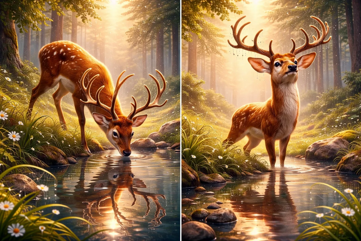 清晨的森林像剛醒來一樣,薄霧輕輕飄著,露珠掛在草尖上。小溪旁,一隻年輕的鹿低頭喝水,喝著喝著,牠看見水面倒映出自己的模樣:頭上的角像樹枝一樣展開,漂亮又威風。鹿越看越喜歡,忍不住挺起胸膛,左看看、右看看,心裡想:「我的角真是全森林最美的!」