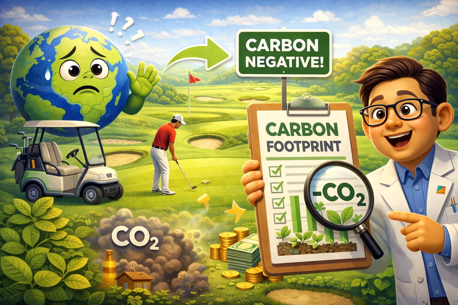 「負碳排」在這裡通常是指:吸收或固定的碳,可能大於產生的碳,所以整體算起來是「淨吸碳」。球場生態像自然棲地,意思是球場裡可能有草地、水域或樹林等環境,讓一些動植物能生存。這也提醒大家:同一種土地使用方式,有些地方管理得好,可能對生態較友善;管理不好,則可能造成浪費或破壞。